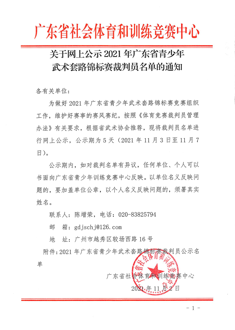 关于网上公示2021年广东省青少年武术套路锦标赛裁判员名单的通知 来源: 发布时间:2021-11-03 15:11:04 浏览次数: 次 【字体:小 大】 终审:崔濠镜 点赞 收藏 分享到: 【打印正文】