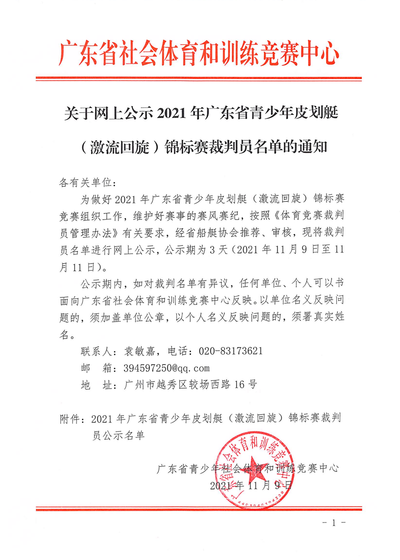 关于网上公示2021年广东省青少年皮划艇(激流回旋)锦标赛裁判员的通知 来源: 发布时间:2021-11-09 12:00:24 浏览次数: 次 【字体:小 大】 终审:袁敏嘉 点赞 收藏 分享到: 【打印正文】