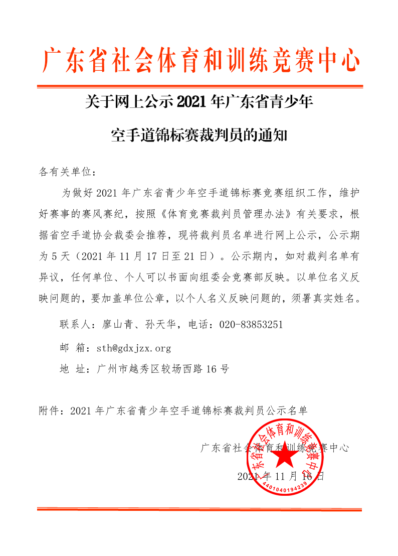 关于网上公示2021年广东省青少年空手道锦标赛裁判员的通知
