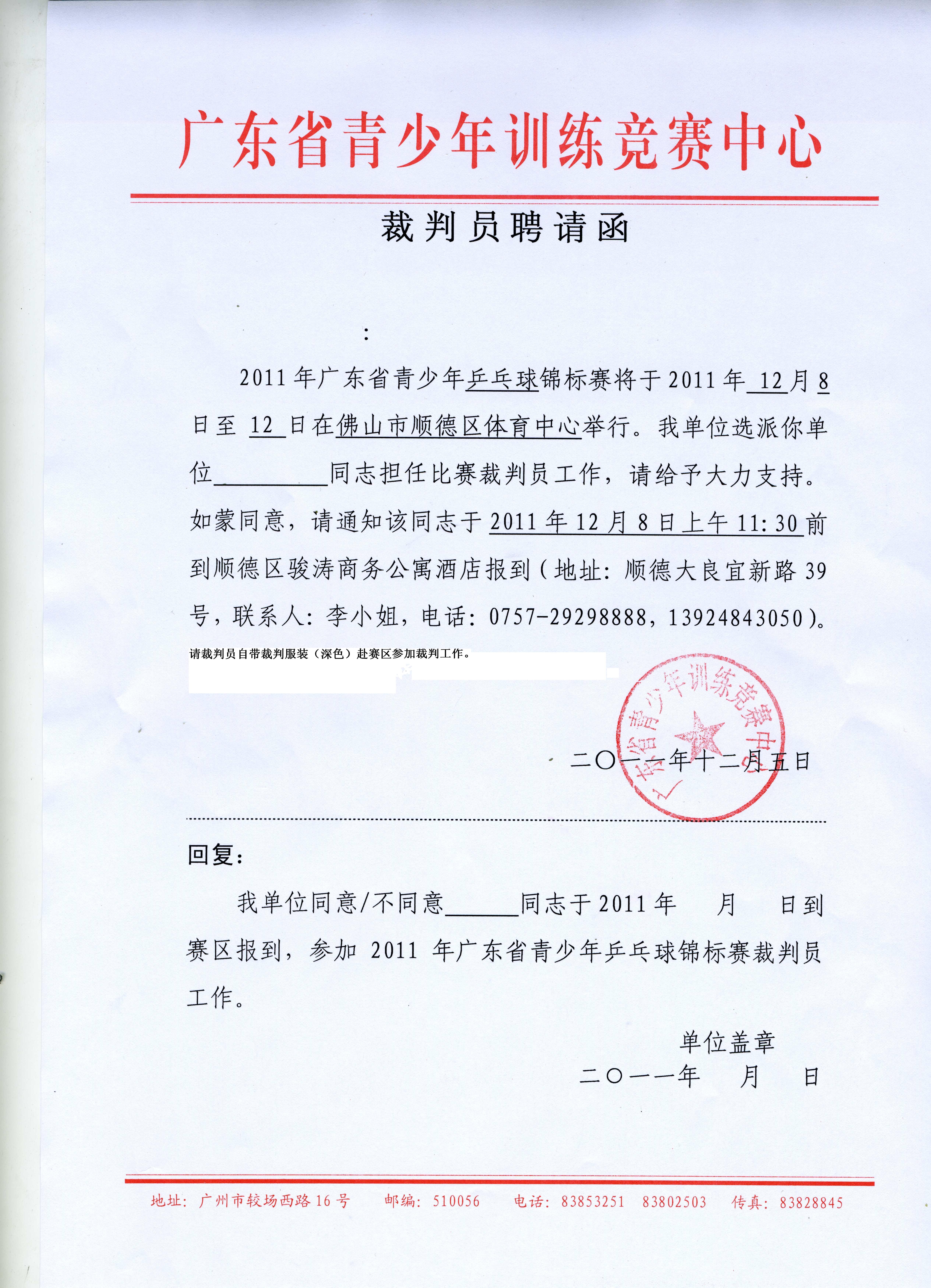 乒乓球锦标赛裁判员聘请函