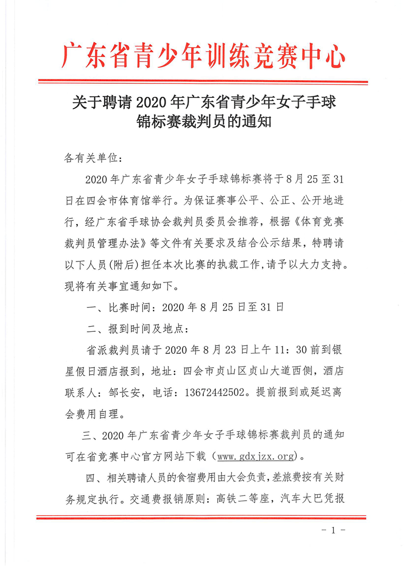 关于聘请2020年广东省青少年女子手球锦标赛裁判员名单的通知 来源: 发布时间:2020-08-03 12:00:01 浏览次数: 次 【字体:小 大】 终审:崔濠镜 点赞 收藏 分享到: 【打印正文】