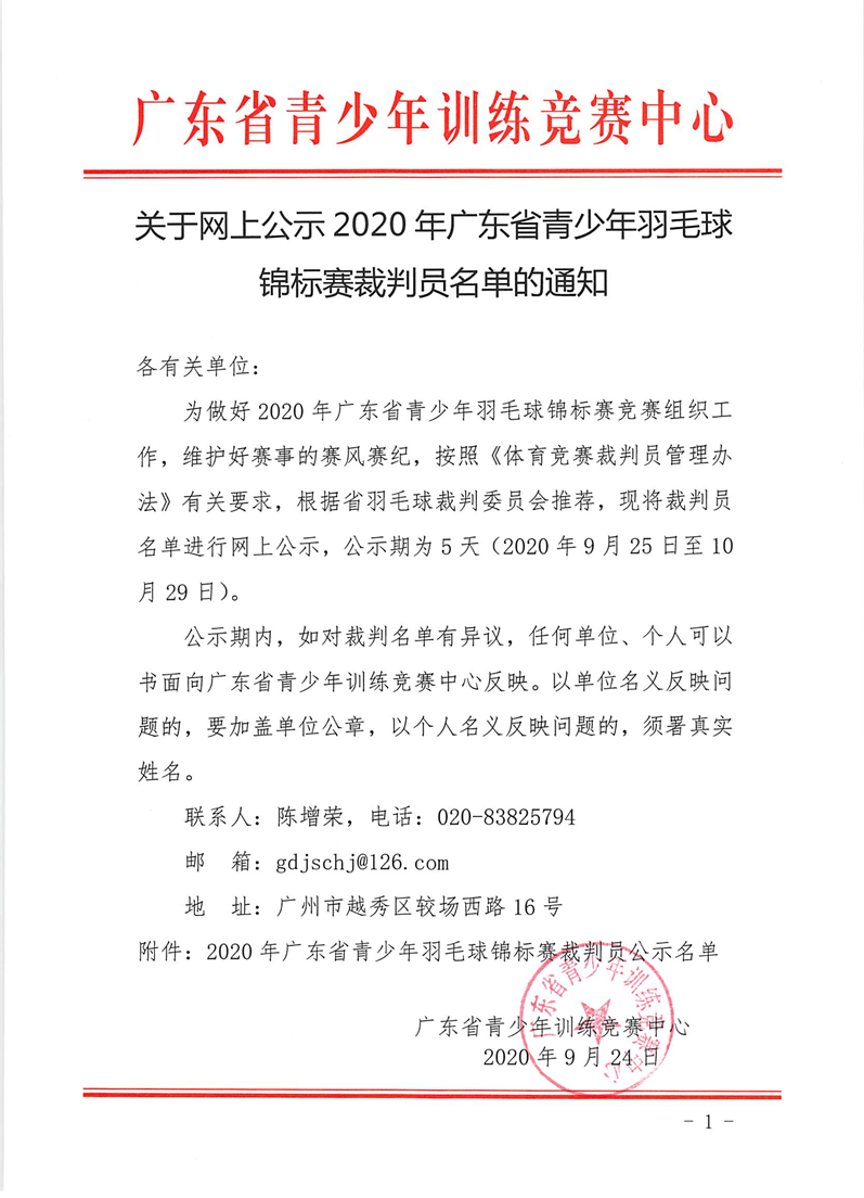关于网上公示2020年广东省青少年羽毛球锦标赛裁判员名单的通知 来源: 发布时间:2020-09-24 10:10:40 浏览次数: 次 【字体:小 大】 终审:崔濠镜 点赞 收藏 分享到: 【打印正文】