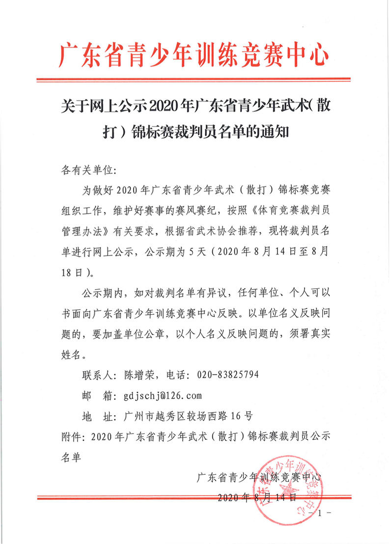 关于网上公示2020年广东省青少年武术(散打)锦标赛裁判员名单的通知 来源: 发布时间:2020-08-14 10:45:02 浏览次数: 次 【字体:小 大】 终审:崔濠镜 点赞 收藏 分享到: 【打印正文】