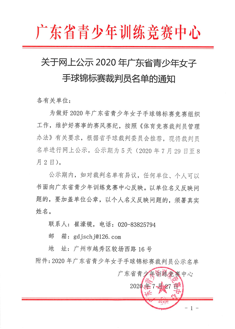 关于网上公示2020年广东省青少年女子手球锦标赛裁判员名单的通知 来源: 发布时间:2020-07-27 10:50:30 浏览次数: 次 【字体:小 大】 终审:崔濠镜 点赞 收藏 分享到: 【打印正文】