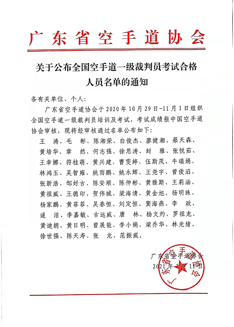 关于公布全国空手道一级裁判员考试合格人员名单的通知