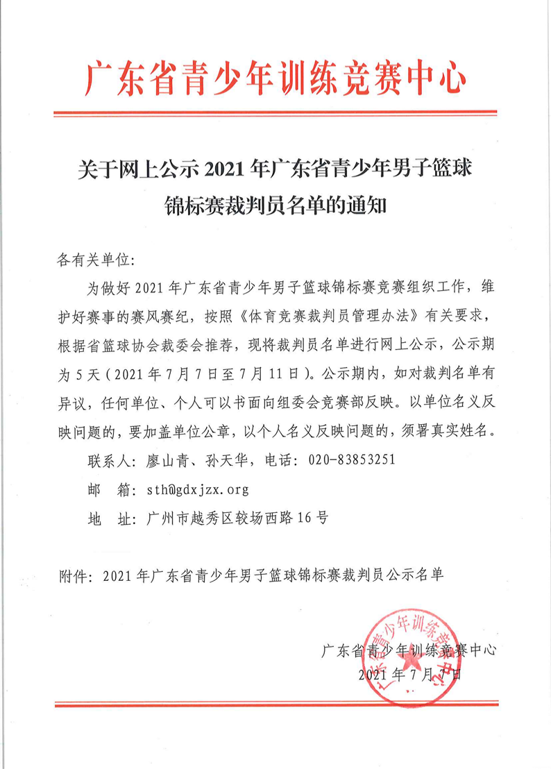 关于网上公示2021年广东省青少年男子篮球锦标赛裁判员名单的通知 来源: 发布时间:2021-07-08 00:34:54 浏览次数: 次 【字体:小 大】 终审:孙天华 点赞 收藏 分享到: 【打印正文】