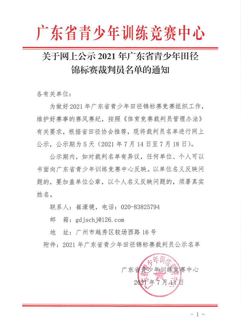 关于网上公示2021年广东省青少年田径锦标赛裁判员名单的通知 来源: 发布时间:2021-07-14 09:19:27 浏览次数: 次 【字体:小 大】 终审:崔濠镜 点赞 收藏 分享到: 【打印正文】