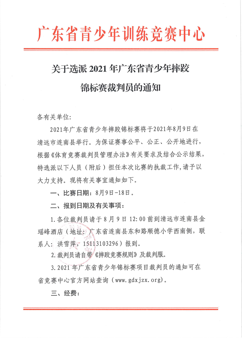 关于选派2021年广东省青少年摔跤锦标赛裁判员的通知