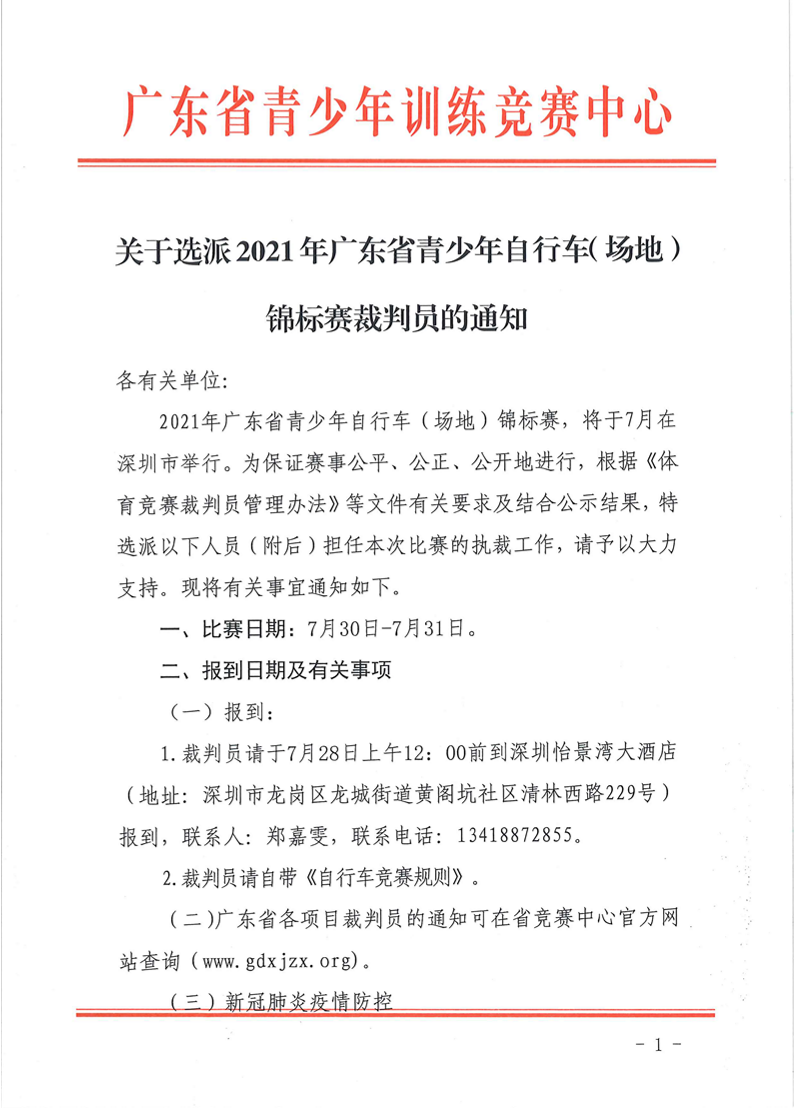 关于选派2021年广东省青少年自行车(场地)锦标赛裁判员的通知 来源: 发布时间:2021-07-26 23:43:44 浏览次数: 次 【字体:小 大】 终审:袁敏嘉 点赞 收藏 分享到: 【打印正文】