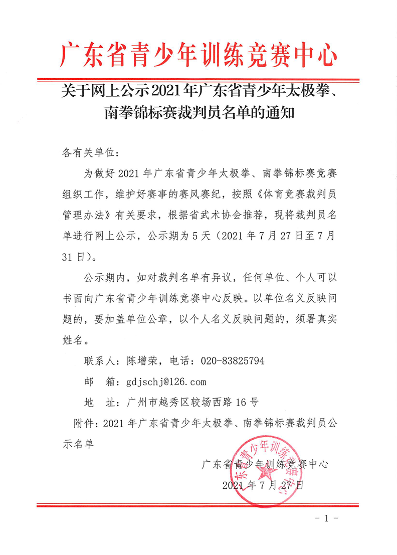 关于网上公示2021年广东省青少年太极拳、南拳锦标赛裁判员名单的通知 来源: 发布时间:2021-07-27 11:41:26 浏览次数: 次 【字体:小 大】 终审:崔濠镜 点赞 收藏 分享到: 【打印正文】