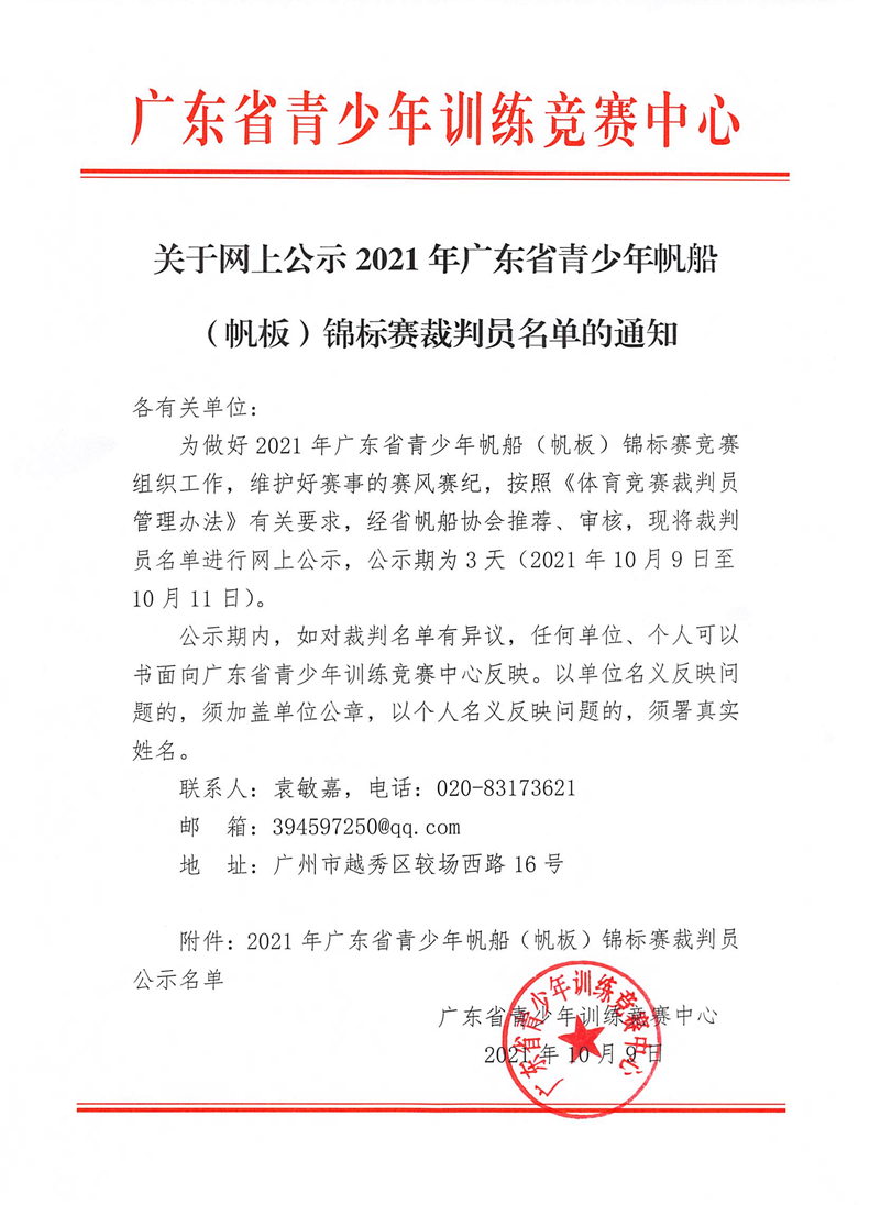 关于网上公示2021年广东省青少年帆船(帆板)锦标赛裁判员名单的通知 来源: 发布时间:2021-10-09 16:00:09 浏览次数: 次 【字体:小 大】 终审:袁敏嘉 点赞 收藏 分享到: 【打印正文】