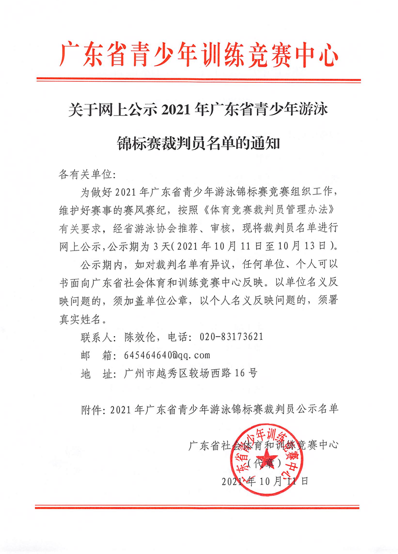 关于网上公示2021年广东省青少年游泳锦标赛裁判员名单的通知 来源: 发布时间:2021-10-11 16:48:46 浏览次数: 次 【字体:小 大】 终审:袁敏嘉 点赞 收藏 分享到: 【打印正文】
