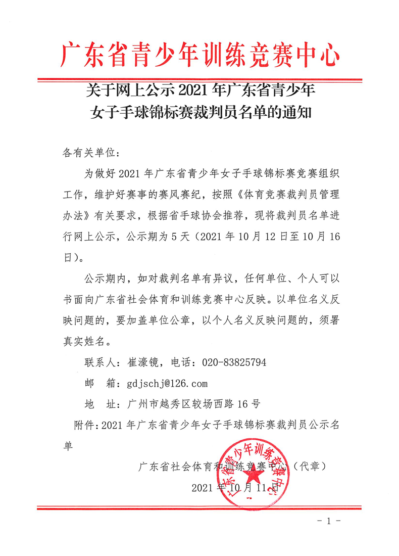 关于网上公示2021年广东省青少年女子手球锦标赛裁判员名单的通知 来源: 发布时间:2021-10-12 08:54:16 浏览次数: 次 【字体:小 大】 终审:崔濠镜 点赞 收藏 分享到: 【打印正文】