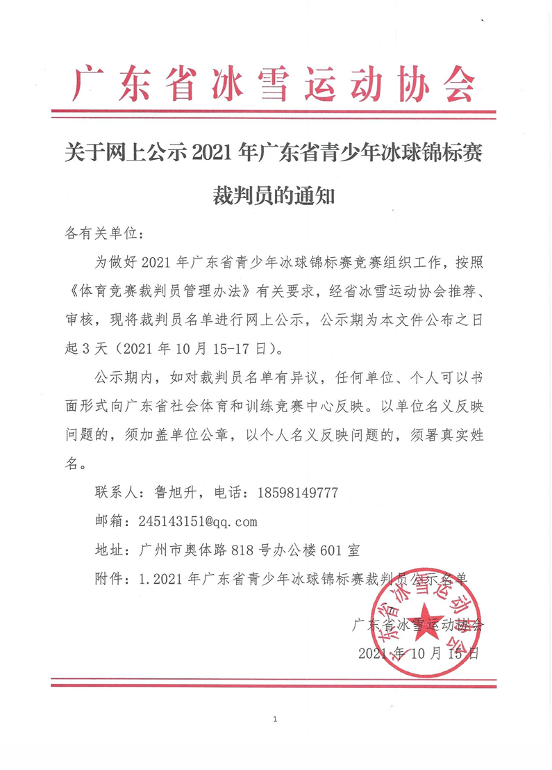 关于网上公示2021年广东省青少年冰球锦标赛裁判员的通知