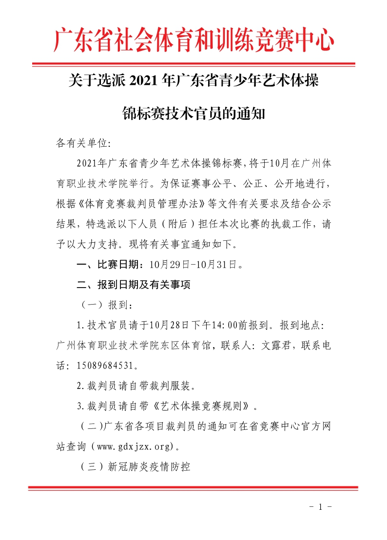 关于选派2021年广东省青少年艺术体操锦标赛技术官员的通知