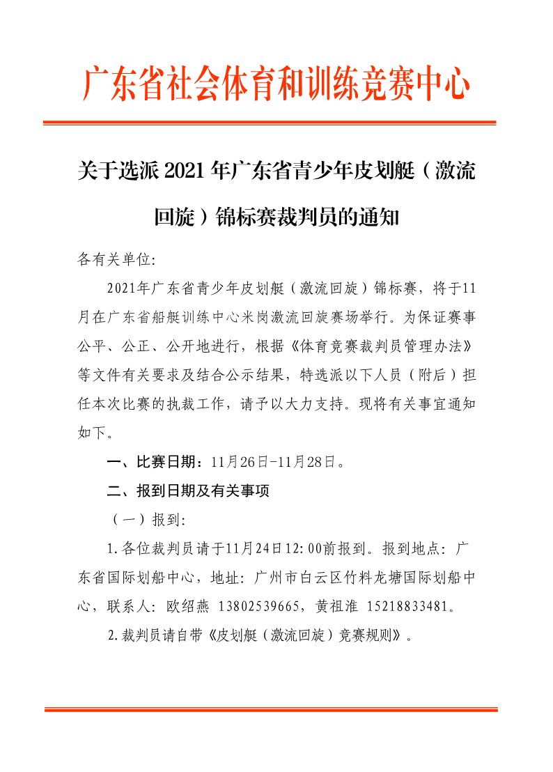 关于选派2021年广东省青少年皮划艇(激流回旋)锦标赛裁判员的通知 来源: 发布时间:2021-11-15 15:12:03 浏览次数: 次 【字体:小 大】 终审:袁敏嘉 点赞 收藏 分享到: 【打印正文】