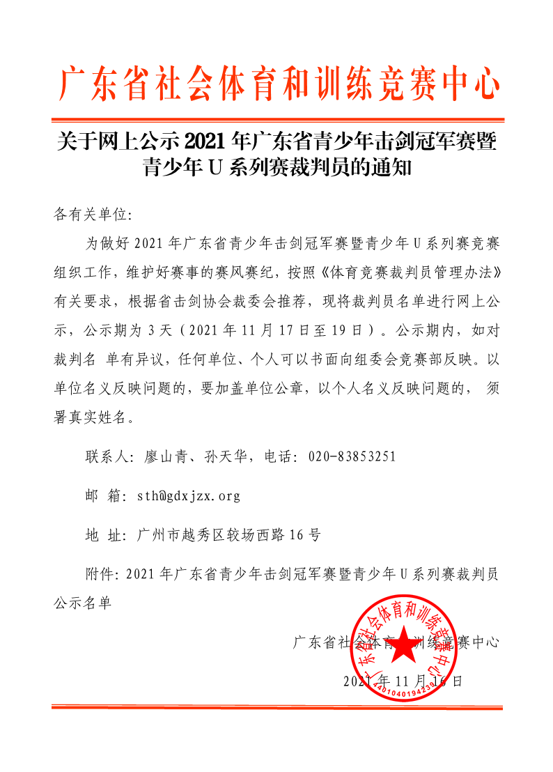 关于网上公示2021年广东省青少年击剑冠军赛暨青少年U系列赛裁判员的通知 来源: 发布时间:2021-11-16 15:29:04 浏览次数: 次 【字体:小 大】 终审:孙天华 点赞 收藏 分享到: 【打印正文】