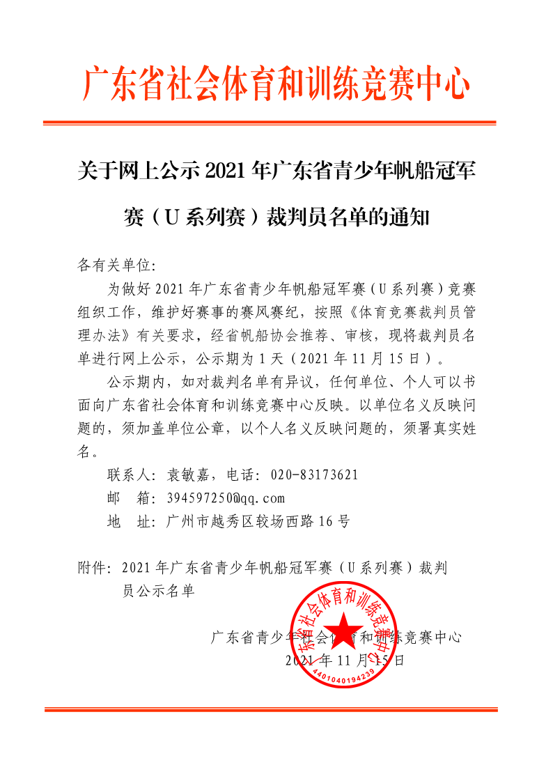 关于网上公示2021年广东省青少年帆船冠军赛(U系列赛)裁判员名单的通知 来源: 发布时间:2021-11-16 16:53:05 浏览次数: 次 【字体:小 大】 终审:袁敏嘉 点赞 收藏 分享到: 【打印正文】