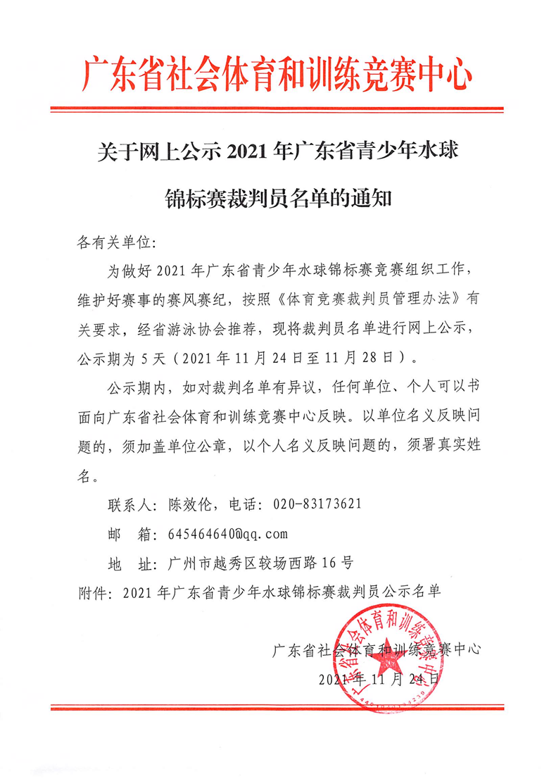 关于网上公示 2021 年广东省青少年水球锦标赛裁判员名单的通知 来源: 发布时间:2021-11-24 10:07:54 浏览次数: 次 【字体:小 大】 终审:袁敏嘉 点赞 收藏 分享到: 【打印正文】
