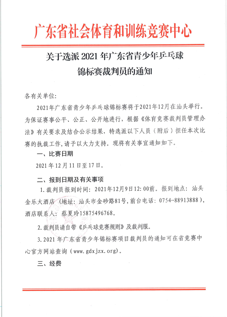 关于选派2021年广东省青少年乒乓球锦标赛裁判员的通知