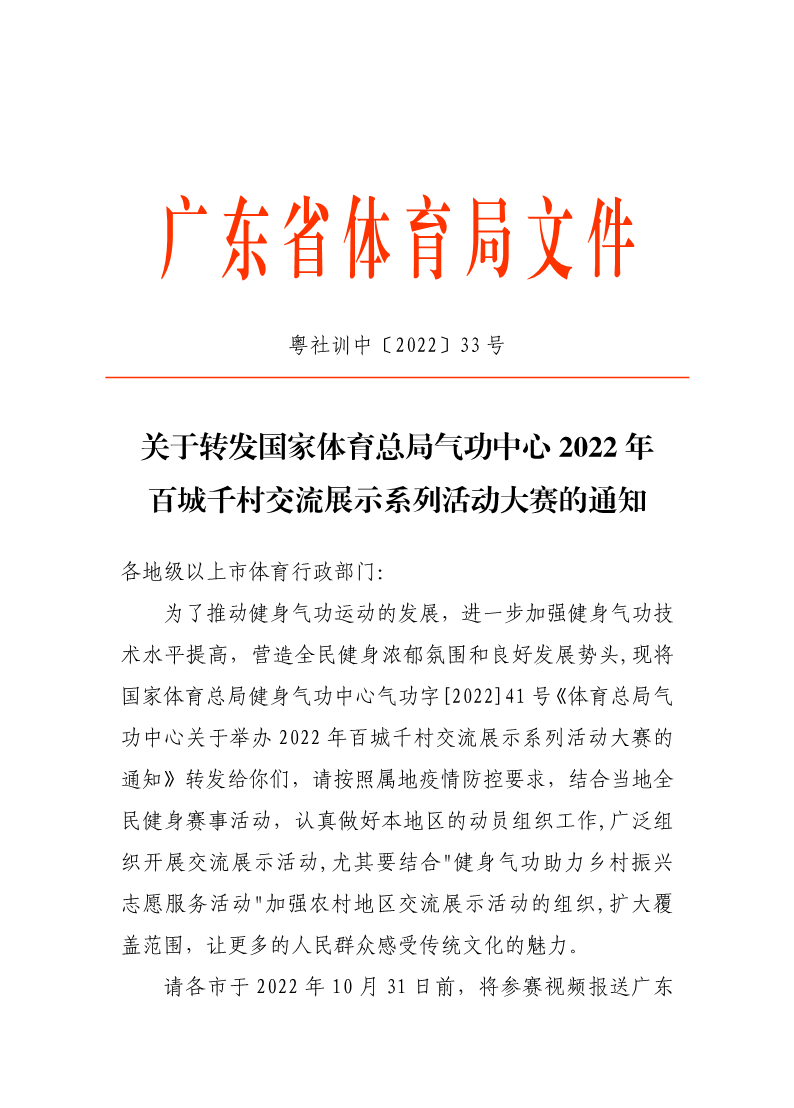 关于转发国家体育总局气功中心2022年百城千村交流展示系列活动大赛的通知 来源: 发布时间:2022-06-15 09:27:10 浏览次数: 次 【字体:小 大】 终审:吴旻龙 点赞 收藏 分享到: 【打印正文】
