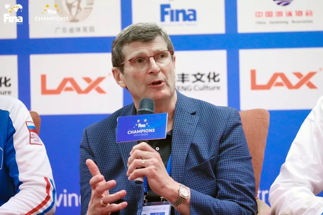 ▲赛后新闻发布会国际泳联戴尔接受采访
