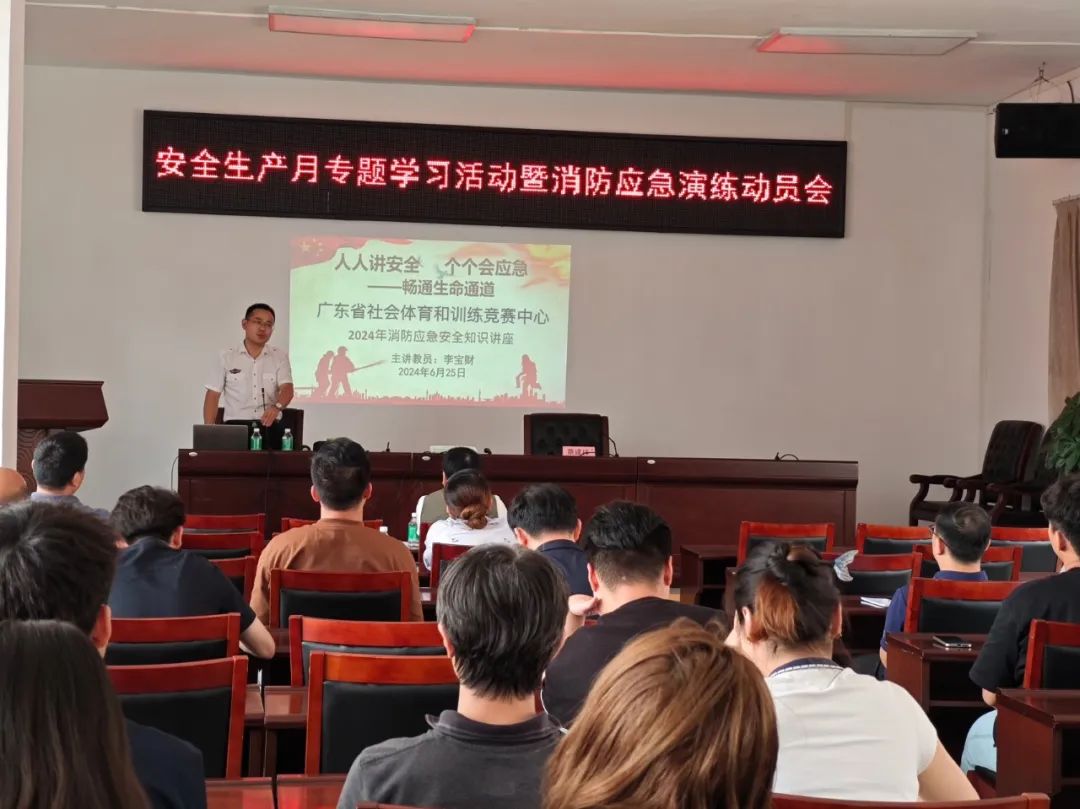 今年6月是第23个全国“安全生产月”,进一步推动“安全生产月”活动走深走实,6月25日下午,广东省社会体育和训练竞赛中心组织开展安全生产专题学习和消防应急演练活动,邀请了专业消防培训讲师举办消防安全专题讲座,以“人人讲安全、个个会应急——畅通生命通道”为主题进行了现场授课。中心主任蔡建祥同志主持会议并就压紧压实安全生产工作责任,落实落细各项防范措施进行部署安排。
