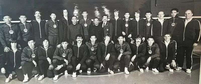 1976年,中国男排访问美国,与美国男排进行交流赛,前排右六为余琰森 图/受访者提供
