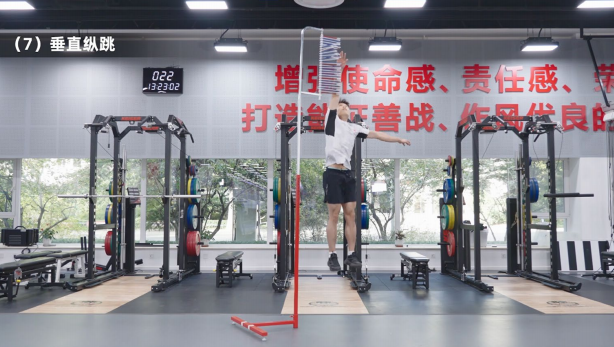 测试要求:开始测试前运动员必须进行充分的热身,以防止受伤。以右臂垂直摸高为例,测试人员首先量取被测试者原地摸高高度(右臂充分上举),注意被测试者身体需保持正直方可测量。被测者站于摸高器下方,不能助跑,双臂自由摆动,尽力垂直向上跳起摸到最大高度,落下。测试前允许有2-3次尝试,被测者有3次跳跃机会,取最好成绩,精确到整数,将该数值减去被测者原地摸高高度得到垂直纵跳成绩,计量单位为厘米。