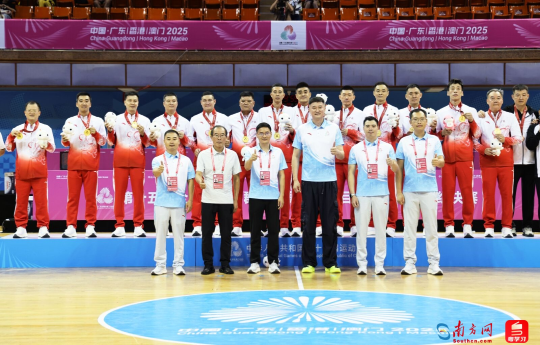 中国男篮前主教练杜锋(前排右三)作为颁奖嘉宾为十五运会群众比赛五人篮球男子C组冠军广东队颁奖并合影