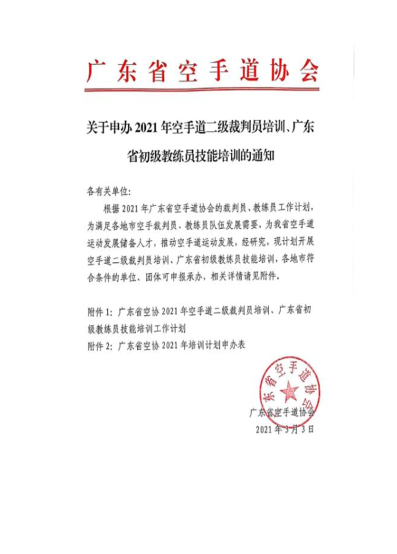 关于申办2021年空手道二级裁判员培训、广东省初级教练员技能培训的通知 来源: 发布时间:2021-03-11 10:04:00 浏览次数: 次 【字体:小 大】 2021年二级裁判、初级教练员培训申办表.doc 终审:孙天华 点赞 收藏 分享到: 【打印正文】