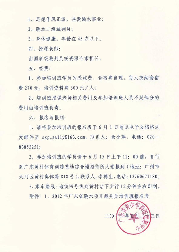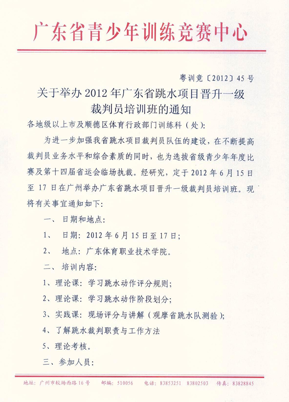 关于举办2012年广东省跳水项目晋升一级裁判员培训班的通知
