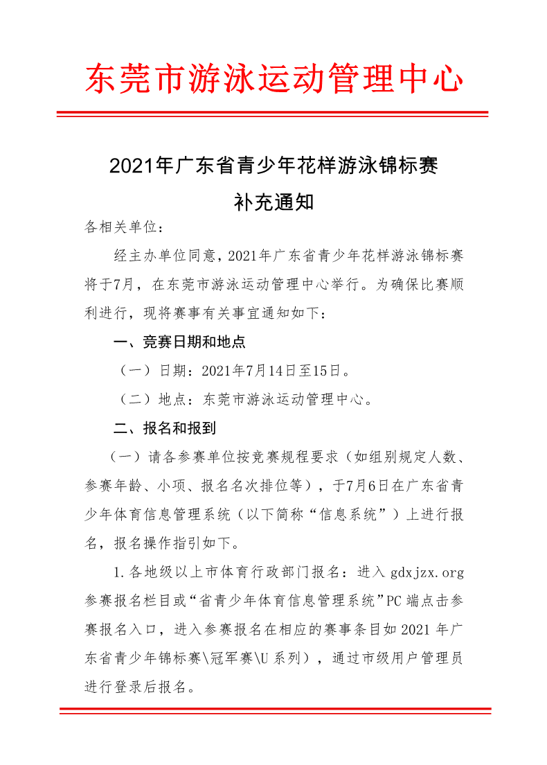 2021年广东省青少年花样游泳锦标赛补充通知