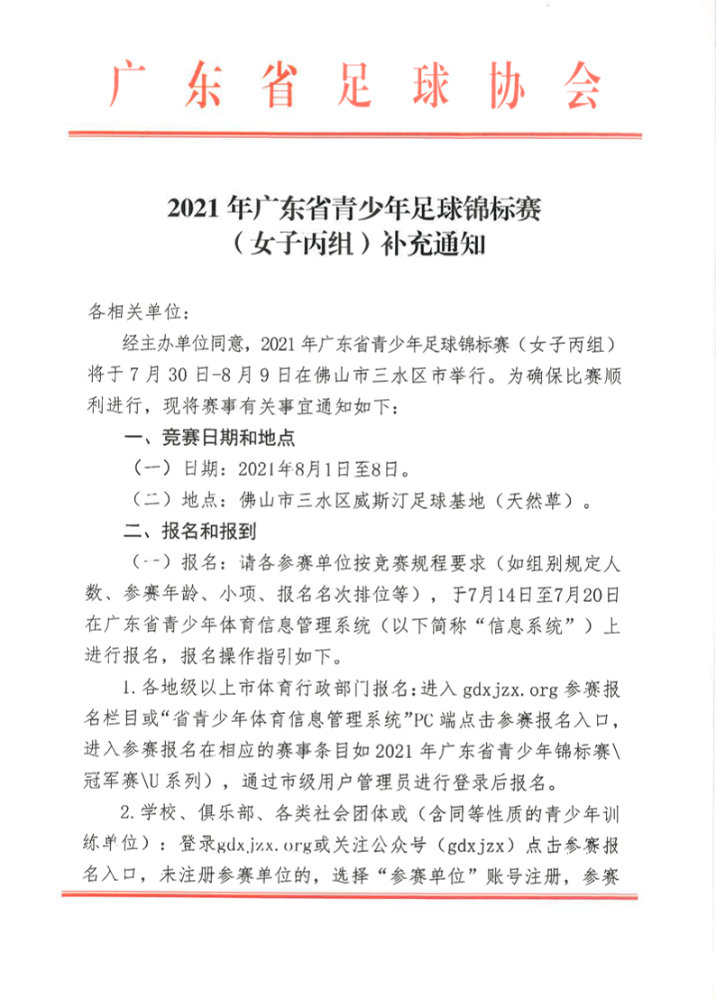 2021年广东省青少年足球锦标赛(女子丙组)补充通知