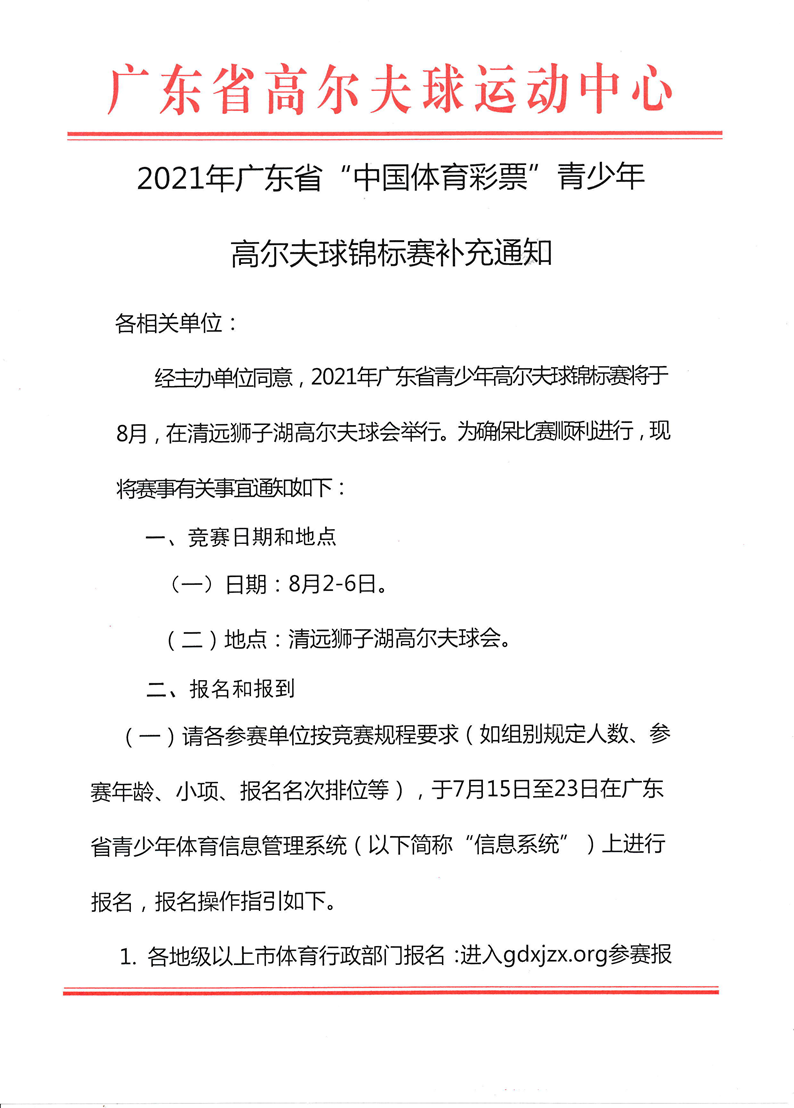 2021年广东省“中国体育彩票”青少年高尔夫球锦标赛补充通知 来源: 发布时间:2021-07-14 14:07:21 浏览次数: 次 【字体:小 大】 终审:袁敏嘉 点赞 收藏 分享到: 【打印正文】