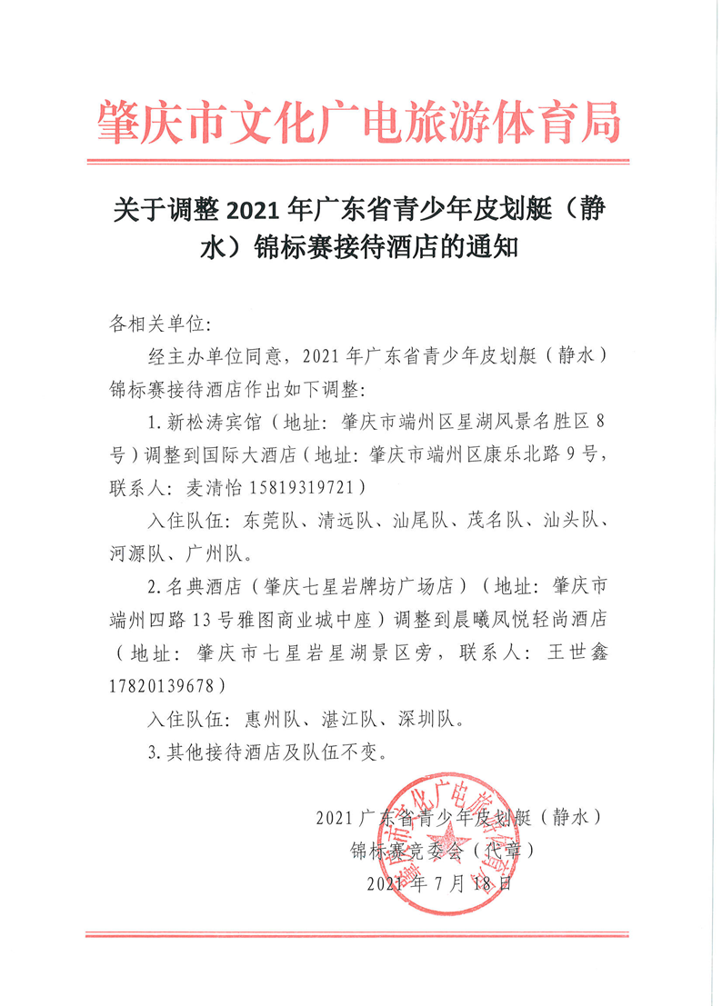 关于调整2021年广东省青少年皮划艇(静水)锦标赛接待酒店的通知 来源: 发布时间:2021-07-18 13:20:13 浏览次数: 次 【字体:小 大】 终审:袁敏嘉 点赞 收藏 分享到: 【打印正文】