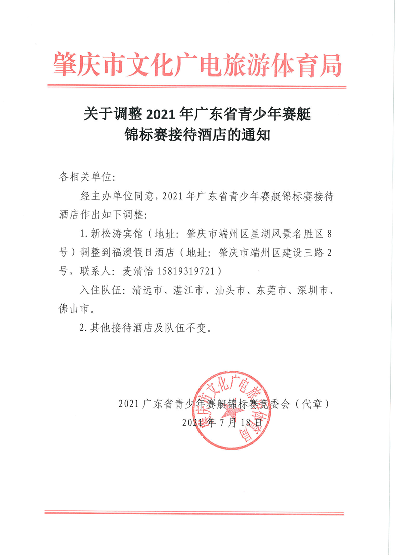 关于调整2021年广东省青少年赛艇锦标赛接待酒店的通知