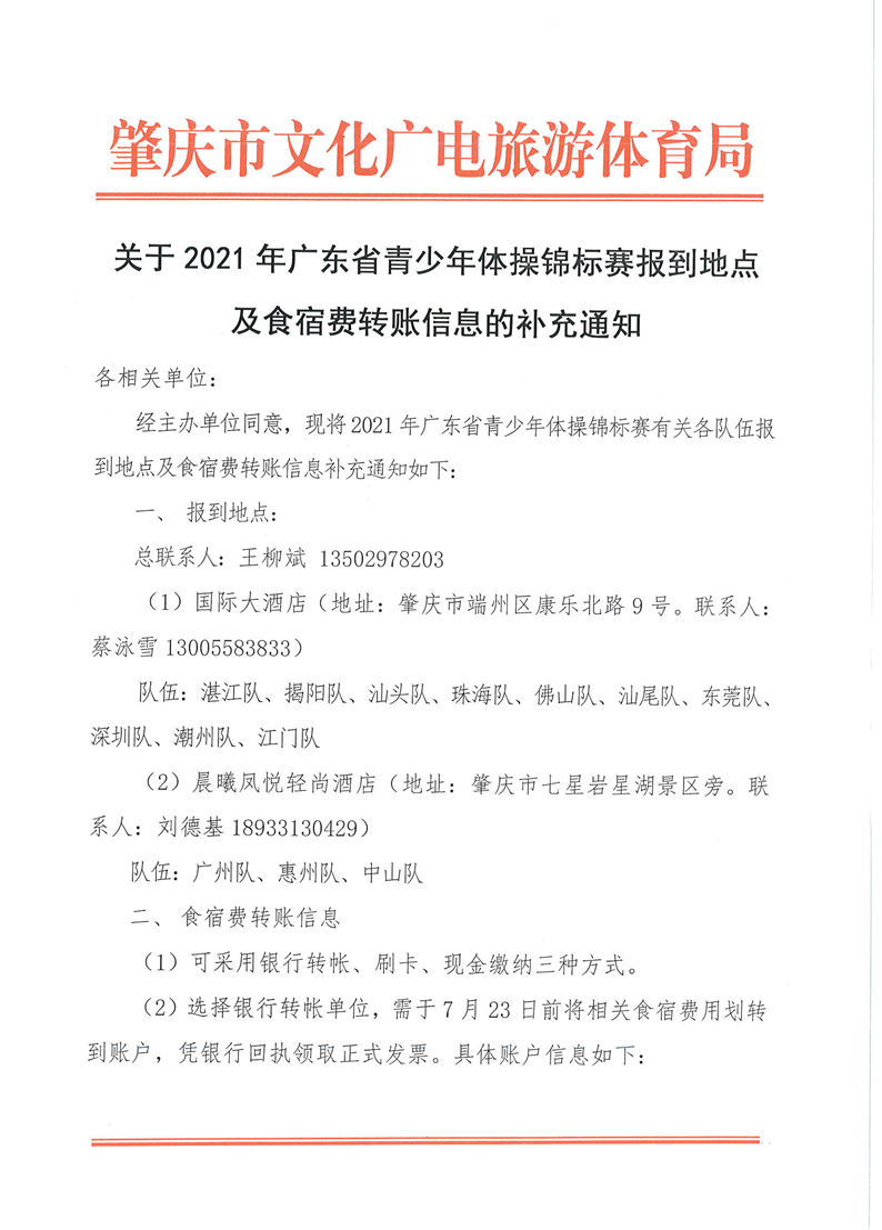 关于2021年广东省青少年体操锦标赛报到地点及食宿费转账信息的补充通知 来源: 发布时间:2021-07-20 11:08:25 浏览次数: 次 【字体:小 大】 终审:袁敏嘉 点赞 收藏 分享到: 【打印正文】
