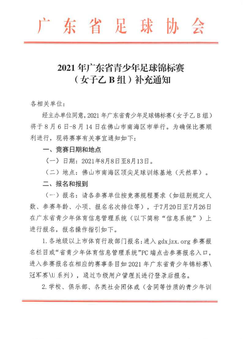 2021年广东省青少年足球锦标赛(女子乙B组)补充通知 来源: 发布时间:2021-07-20 17:00:54 浏览次数: 次 【字体:小 大】 附件:1.2021广东省青少年锦标赛承诺书(三份附件)2.队伍报到情况回执表 终审:HYP 点赞 收藏 分享到: 【打印正文】