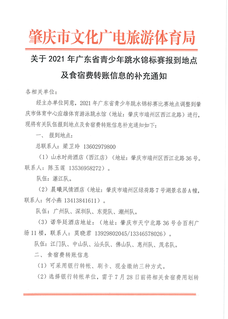 关于2021年广东省青少年跳水锦标赛报到地点及食宿费转账信息的补充通知. 来源: 发布时间:2021-07-22 09:45:34 浏览次数: 次 【字体:小 大】 终审:袁敏嘉 点赞 收藏 分享到: 【打印正文】