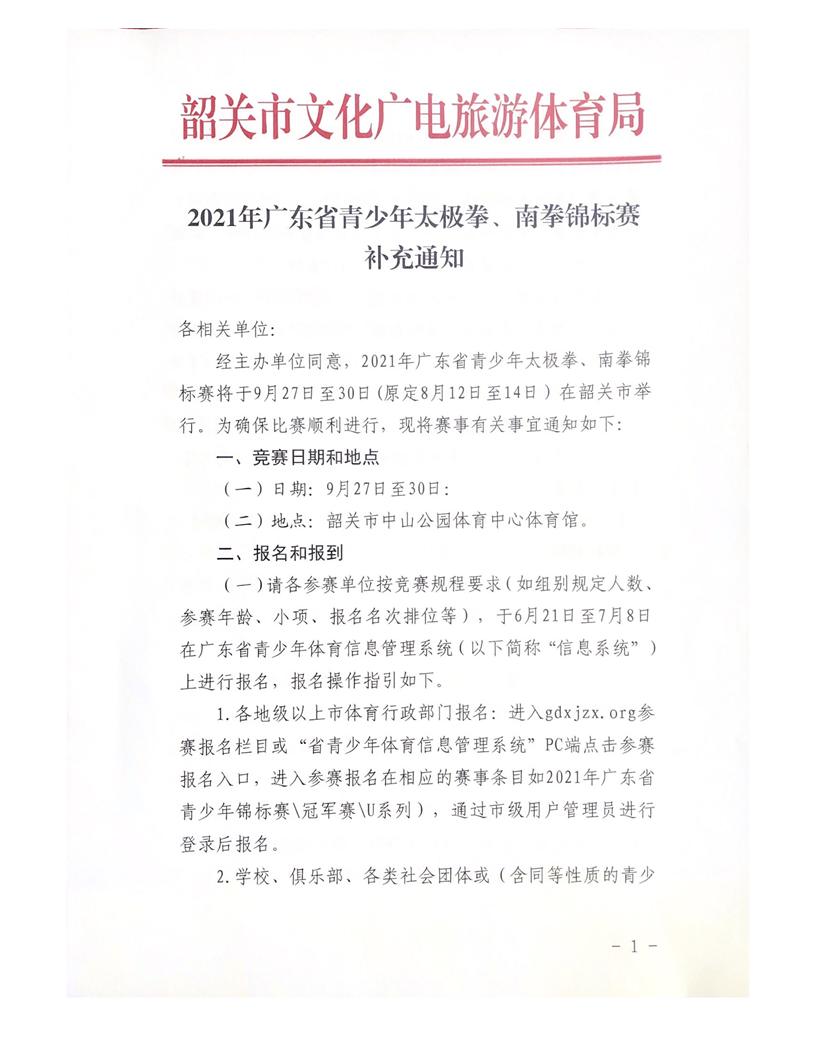 2021年广东省青少年太极拳、南拳锦标赛补充通知