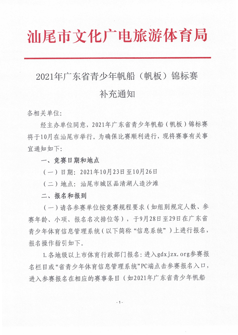 2021年广东省青少年帆船(帆板)锦标赛补充通知