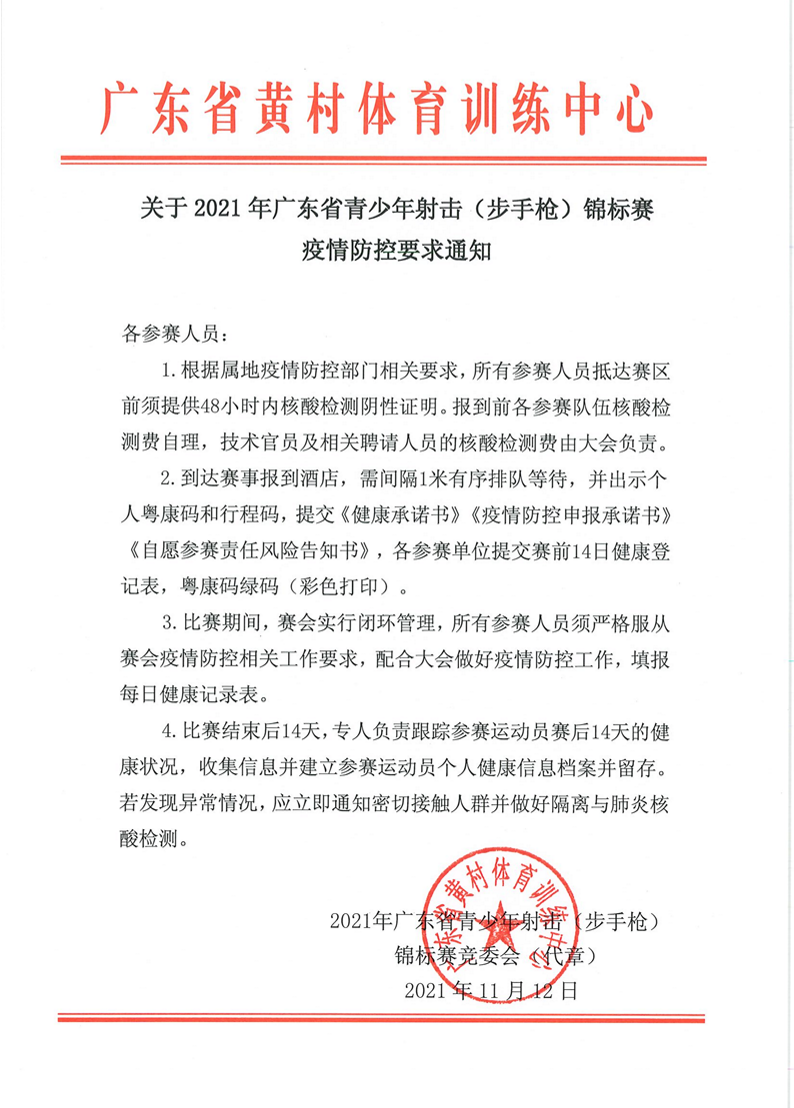 关于2021年广东省“中国体育彩票”青少年射击(步手枪)锦标赛疫情防控要求通知 来源: 发布时间:2021-11-19 09:38:43 浏览次数: 次 【字体:小 大】 终审:崔濠镜 点赞 收藏 分享到: 【打印正文】