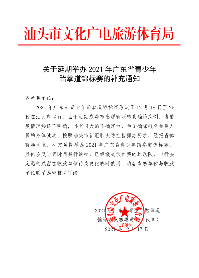 关于延期举办2021年广东省青少年跆拳道锦标赛的补充通知
