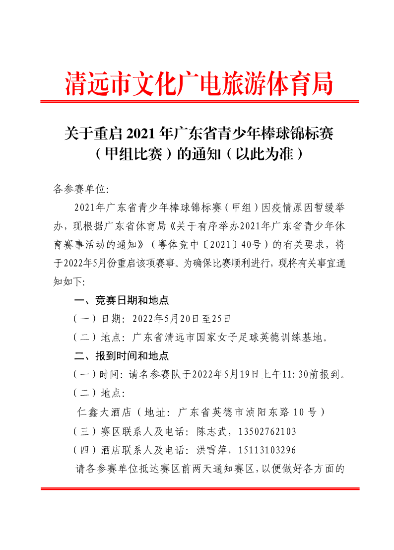 关于重启2021年广东省青少年棒球锦标赛(甲组比赛)的通知(以此为准) 来源: 发布时间:2022-05-11 11:35:52 浏览次数: 次 【字体:小 大】 终审:崔濠镜 点赞 收藏 分享到: 【打印正文】