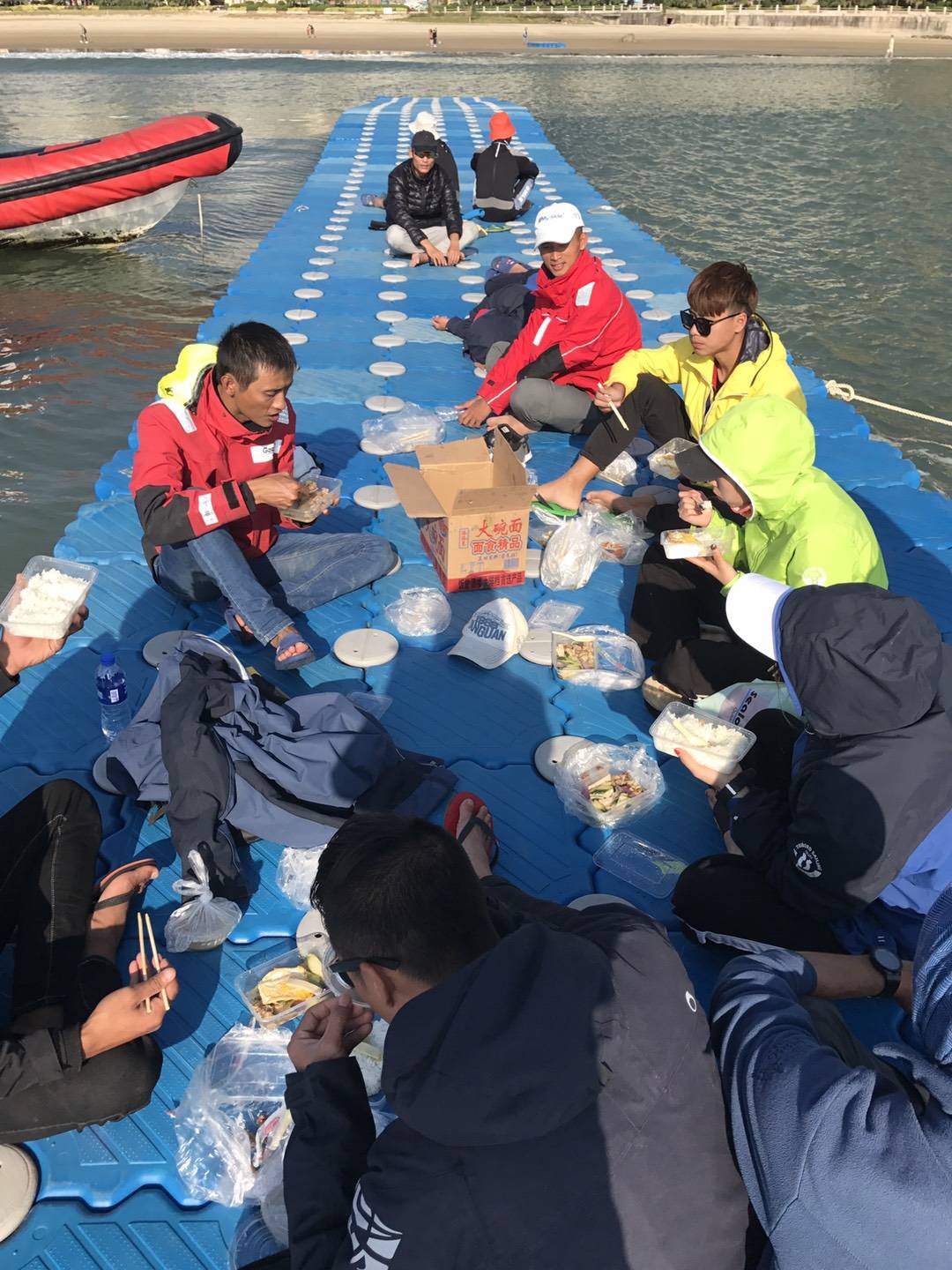 在海上伴着阳光和海风匆匆享受简单的午餐