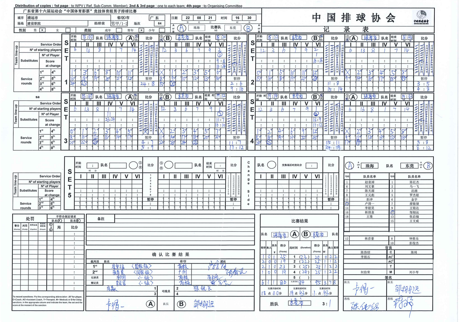 广东省第十六届运动会竞技体育组男子排球甲组记录表