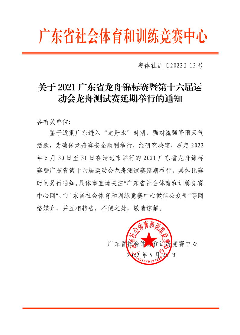 关于2021广东省龙舟锦标赛暨第十六届运动会龙舟测试赛延期举行的通知 来源: 发布时间:2022-05-26 09:36:40 浏览次数: 次 【字体:小 大】 终审:吴旻龙 点赞 收藏 分享到: 【打印正文】