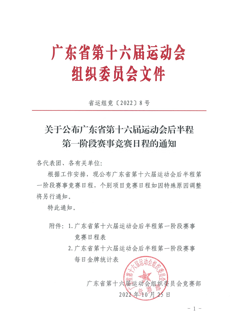 关于公布广东省第十六届运动会后半程第一阶段赛事竞赛日程的通知 来源: 发布时间:2022-10-26 14:32:19 浏览次数: 次 【字体:小 大】 终审:黄丽晓 点赞 收藏 分享到: 【打印正文】