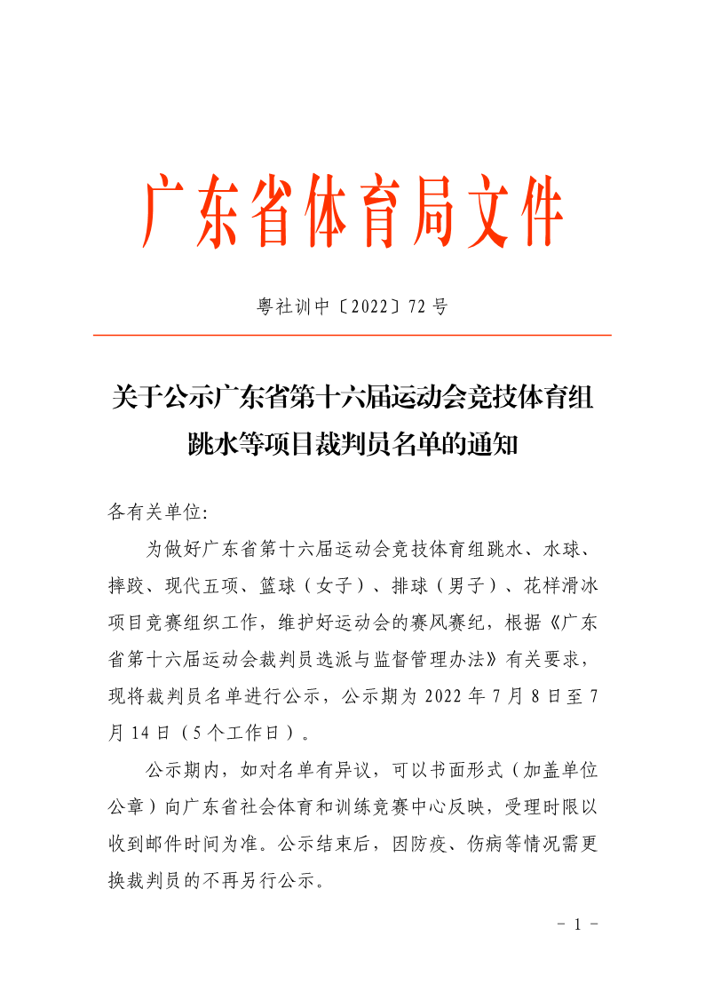关于公示广东省第十六届运动会竞技体育组跳水等项目裁判员名单的通知 来源: 发布时间:2022-07-08 20:35:13 浏览次数: 次 【字体:小 大】 终审:黄丽晓 点赞 收藏 分享到: 【打印正文】